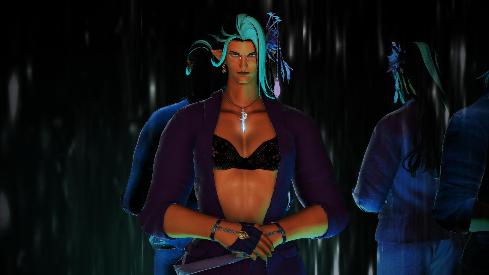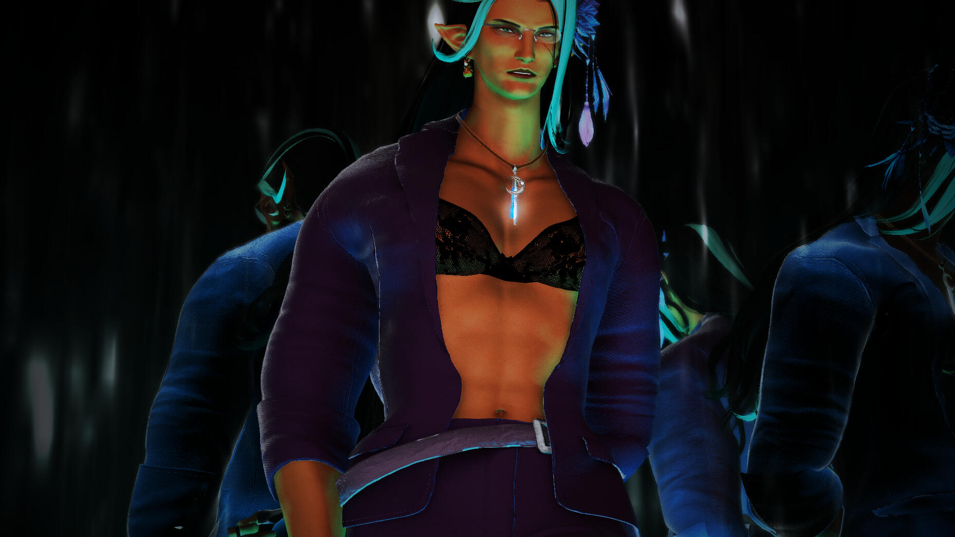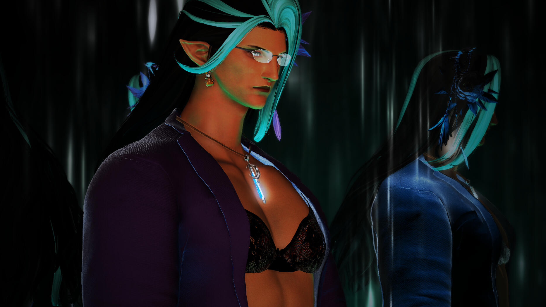 Build: Overly tall even for an Elezen. Muscular and curvy silhouette. Wavy black-and-teal hair.