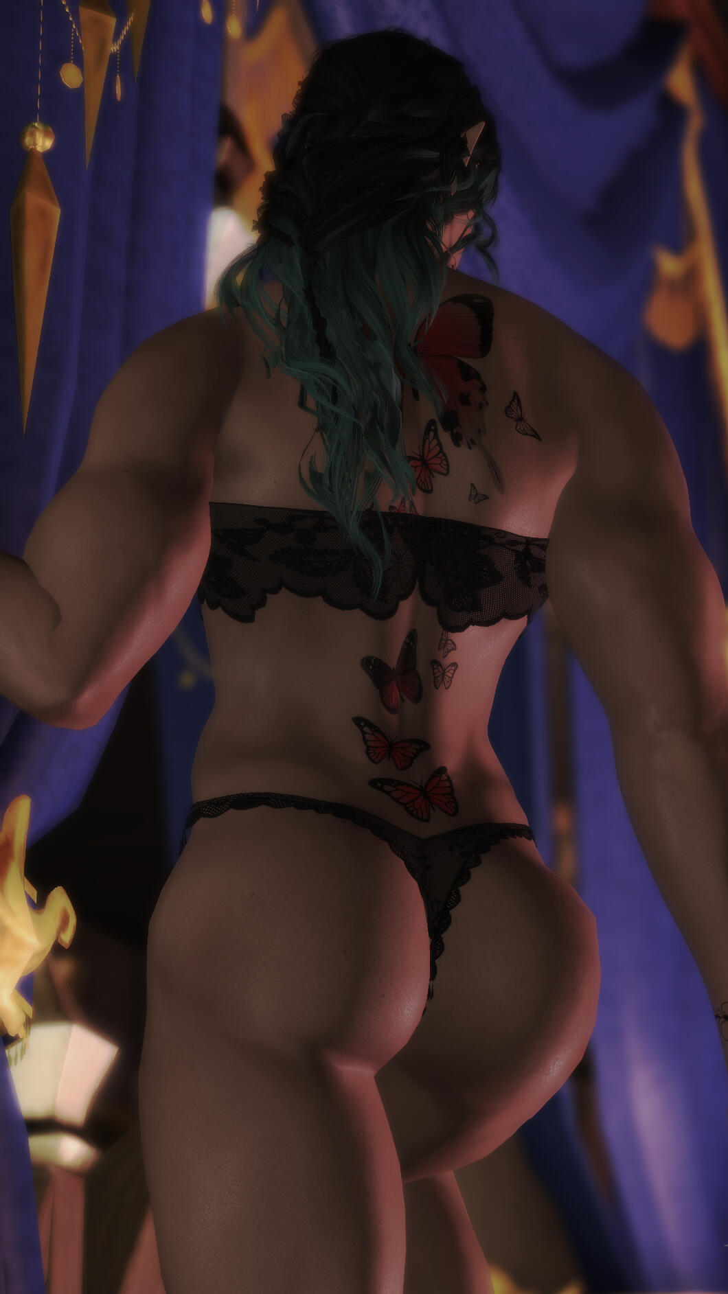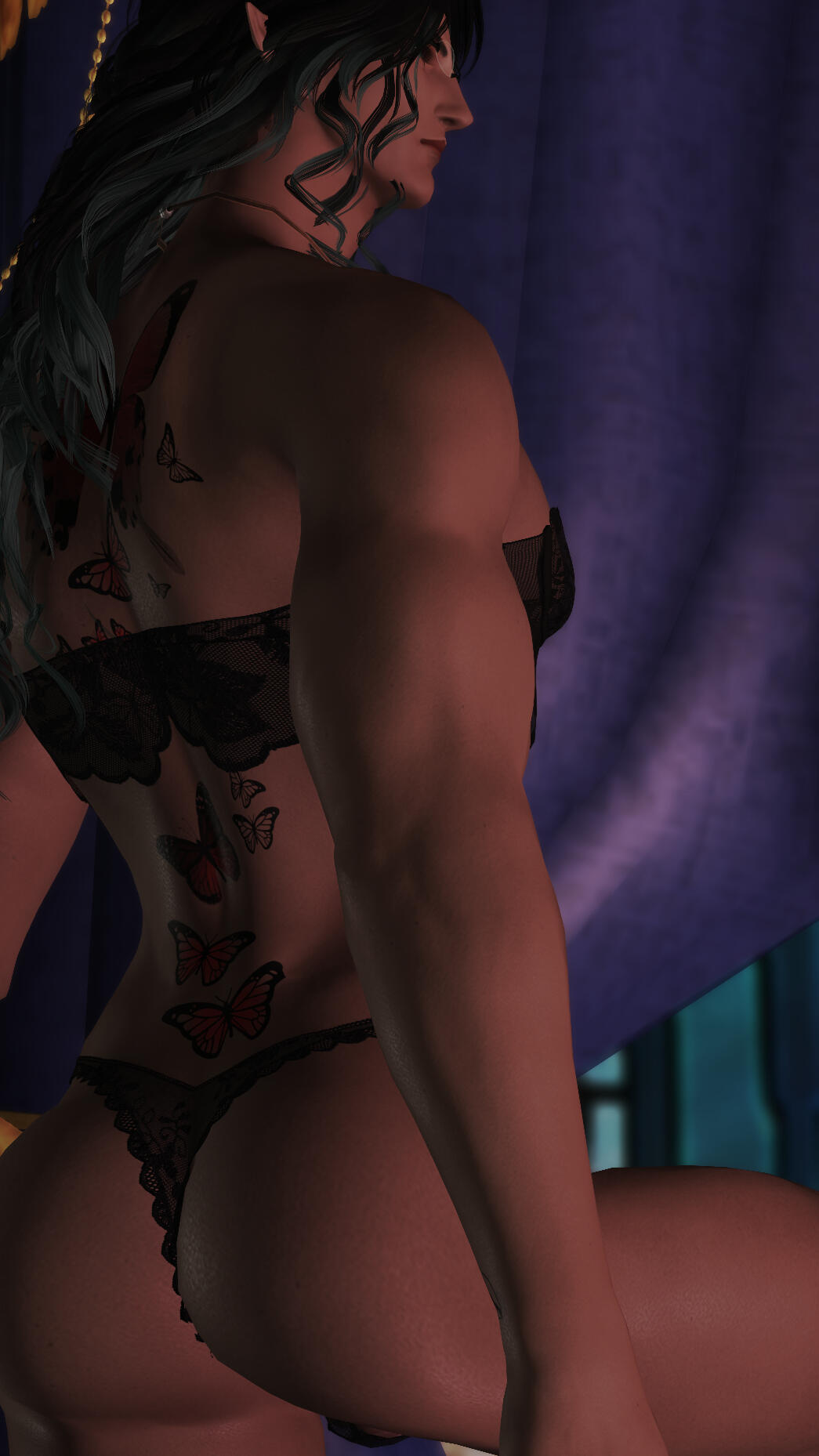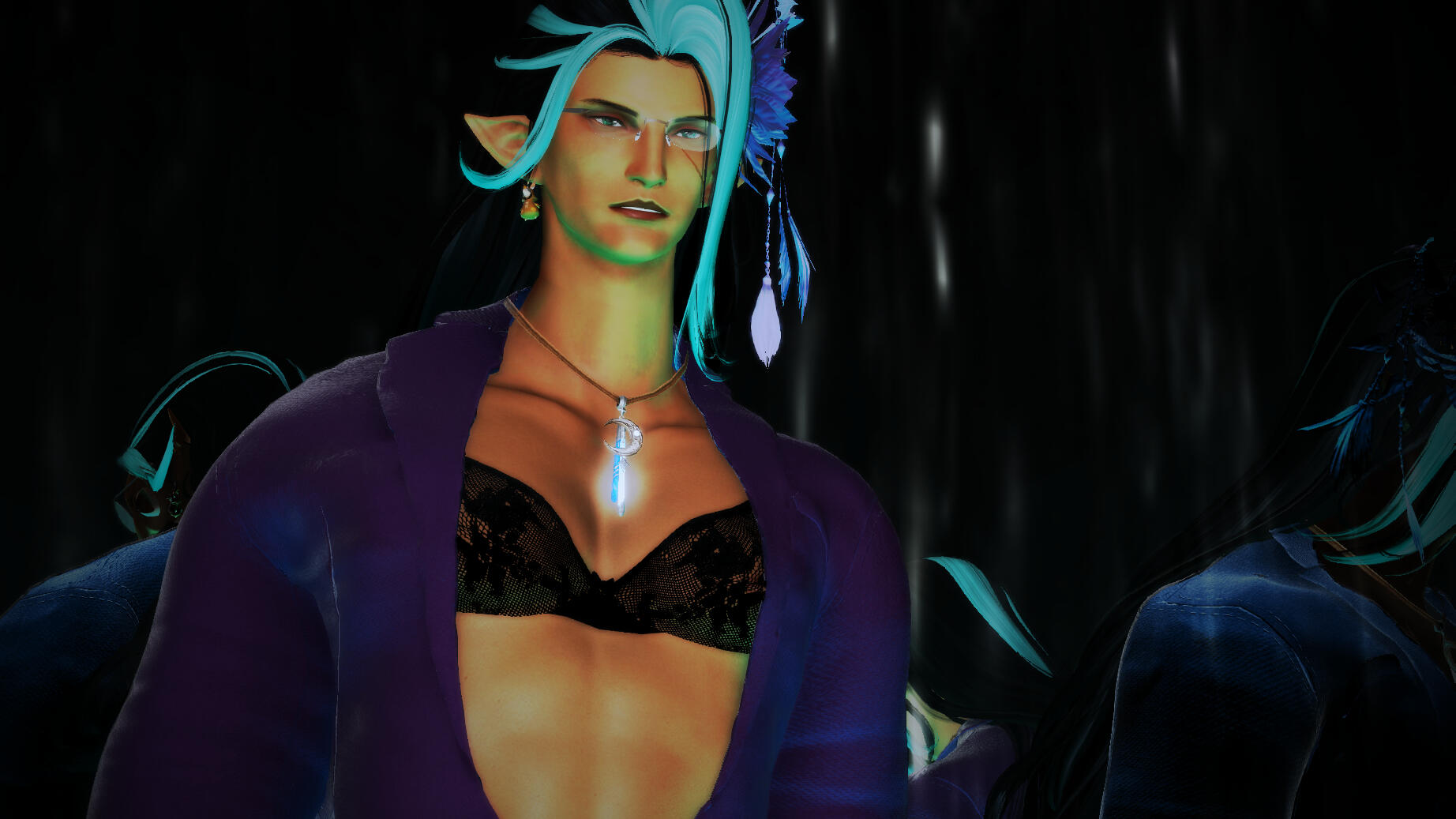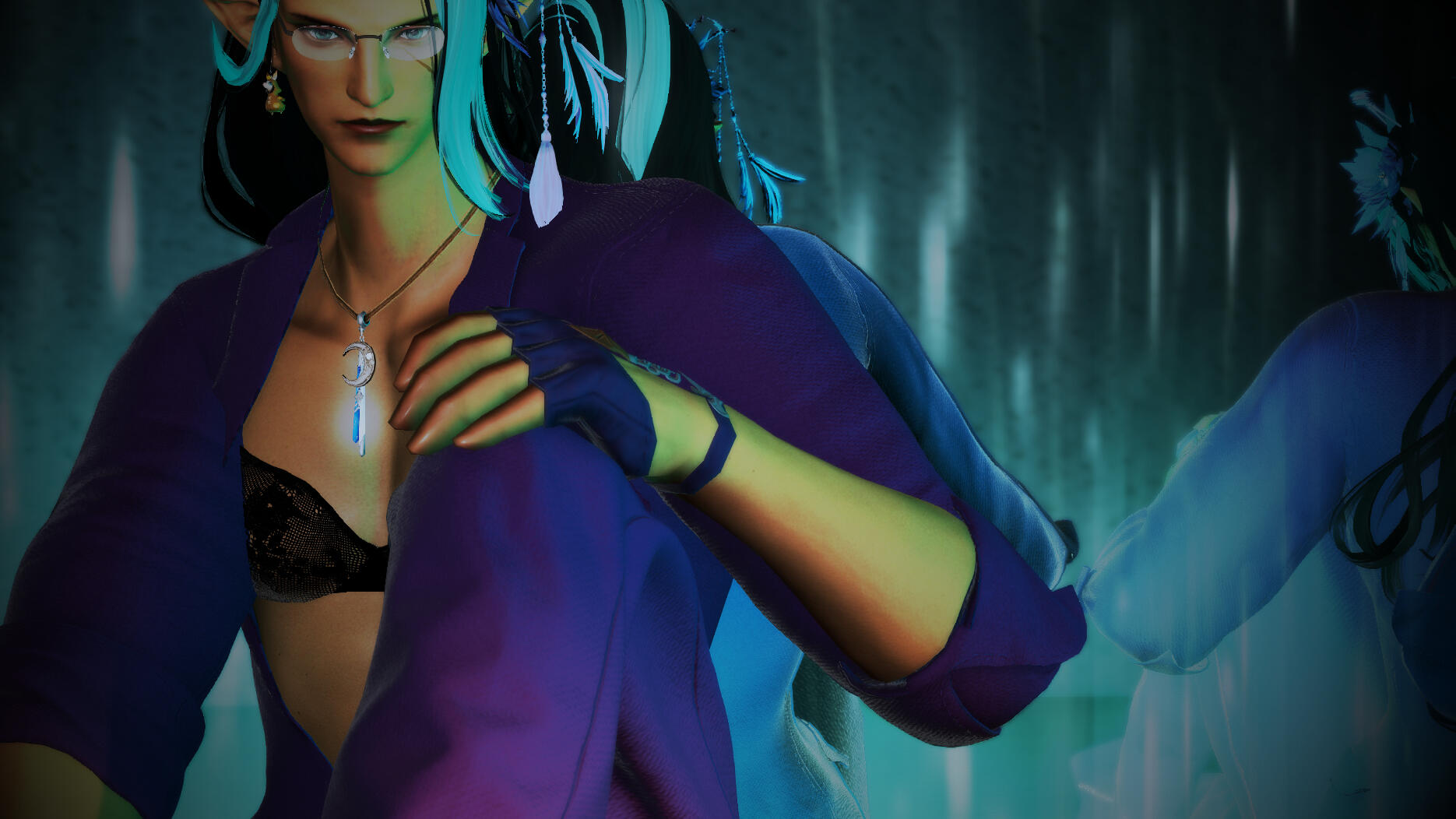 Build: Overly tall even for an Elezen. Muscular and curvy silhouette. Wavy black-and-teal hair.